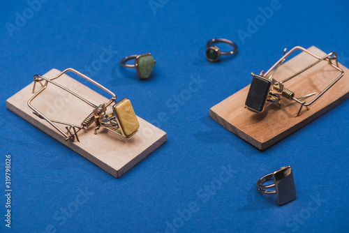 Close up view of jewellery rings with gemstones and mouse traps on blue background