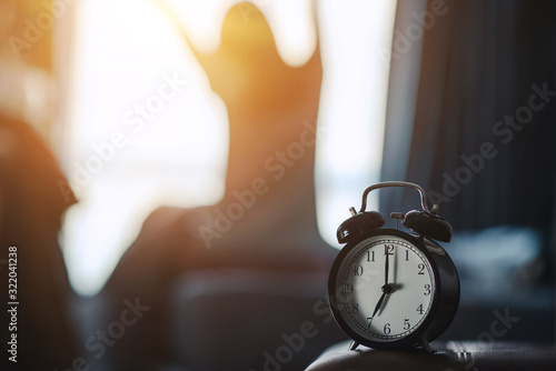 Closeup alarm clock having a good day with background happy woman stretching in bed after waking up, sunlight in morning.