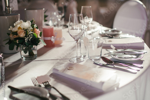 Closeup beautiful table decoration, with fresh peonies and greenery, pink candles, silver candlestick., wine glasses and plates