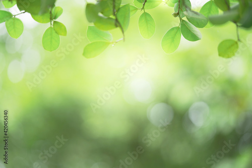 Closeup beautiful view of nature green leaf on greenery blurred background with sunlight and copy space. It is use for natural ecology summer background and fresh wallpaper concept.