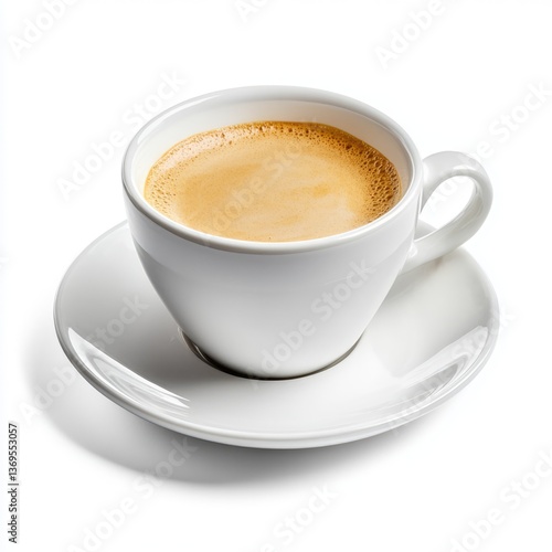 Closeup coffee cup on saucer isolated on white background beverage photography minimalist style