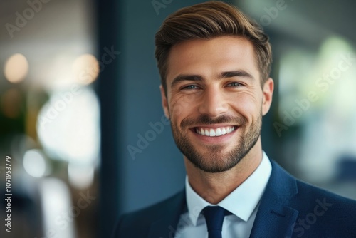 Close-up headshot Confident European young man, good looking young man, middle aged leader, male businessman CEO on blurred office background. Handsome young European businessman smiles at the camera