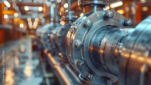 Close-up image of a steel pipeline with flanges and bolts, illuminated in a factory setting with bokeh lights.