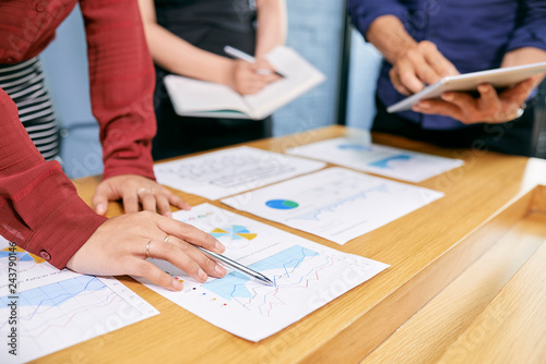 Close-up image of financial analysts checking statistics in financial documents