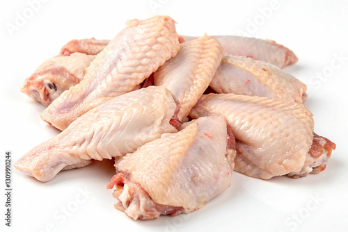 Close-up image of several fresh, raw chicken wings arranged on a white surface.