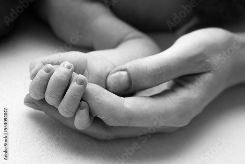Close-up little hand of child and palm of mother and father. The newborn baby has a firm grip on the parent's finger after birth. A newborn holds on to mom's, dad's finger. Black and white photo.