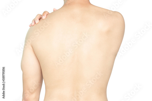 Closeup man hand holding shoulder with pain on white background, health care and medical concept