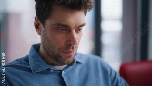 Closeup manager tired work sitting company workspace alone. Serious businessman