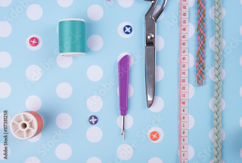 closeup needles, thread spool, scissors, button on blue wooden background.