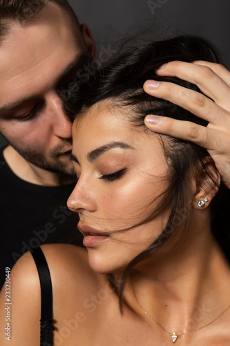 Closeup of a beautiful couple. A man sensually touches his lips to the forehead of a girl whose shoulder is bare. Casual fashionable style. Lifestyle, fashion, commercial design