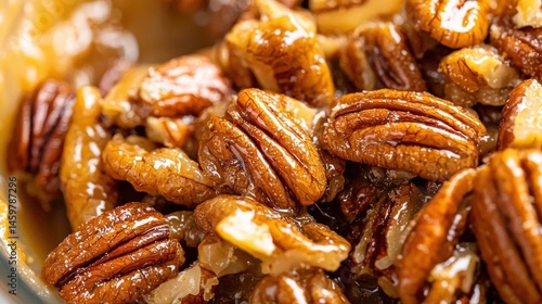 bowl, candied, pecan, nut, gold, brown, colours, glossy, sheen, arranged, circular, pattern, overlapping, coated, sugar, glaze, visible, drizzled, savoury, favor, filled, rimmed, fruit, background, blurred, making, focal, photo