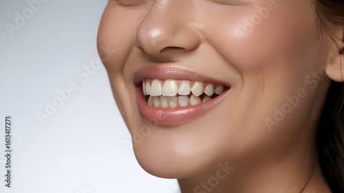 Close-up of a bright, cheerful smile showcasing perfect white teeth and smooth skin