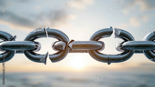 Close-up of a broken metal chain link against a sunset backdrop, symbolizing disruption and resilience in connections.