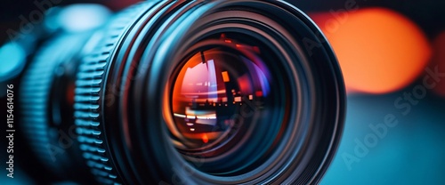 Close-up of a camera lens showcasing intricate details and reflections.