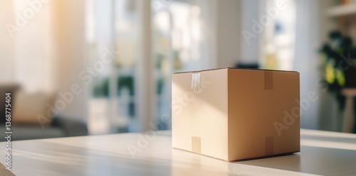 Close-up of a cardboard box on a white wooden table, with a blurred background featuring a window and home interior.