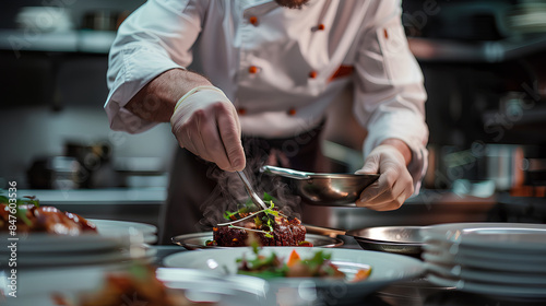 Close-up of a chef preparing gourmet food in a professional kitchen