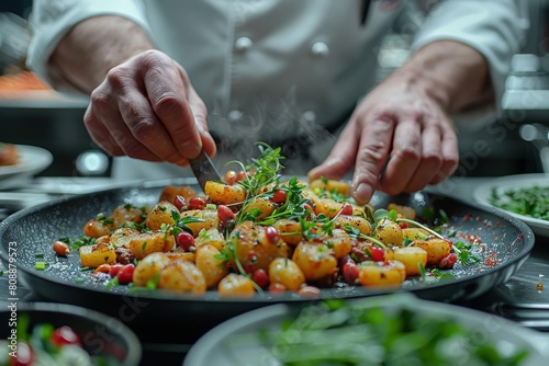 chef, scallop, seasoning, favor, epicure, cookery, precision, delicious, food, culinary, fine dining, seafood, eatery, kitchen, action, closeup, herb, garnish, texture, flavouring, finesse, gastronomy, palette, plating, heat, professionalism, aroma, ingredient, taste, culinary arts