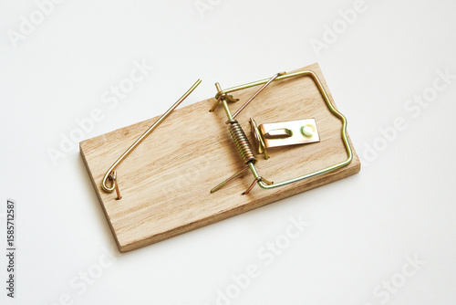 Close-up of a classic wooden mousetrap with a metal spring mechanism, isolated on white background. Traditional rodent control device used for pest management and protection.