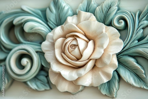 rose, flower, floral, vintage, carved, sculpted, teal, white, cream, elegant, ornate, leaf, leaf, baroque, rococo, design, pattern, relief, texture, background, decorative, art, craft, hand-made, detailed, botanical, nature, macro, closeup, studio shot, fine art, intricate, classic, luxurious, romantic, gentle, soft, pastel, delicate, ornamental