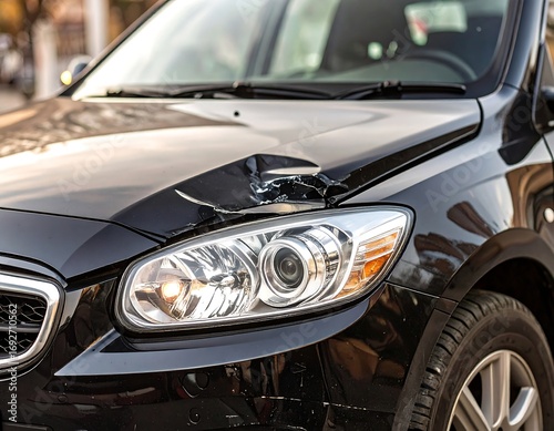 car, hood, damaged, headlamp, black, vehicle, front, closeup, bumper, repair, accident, sunlight, detail, glasses, dark, automobile, modern, exterior, damage, broken, plastic, metal, parking, city, day, urban