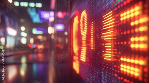 Close-up of a digital stock market display showing numbers and bar charts,