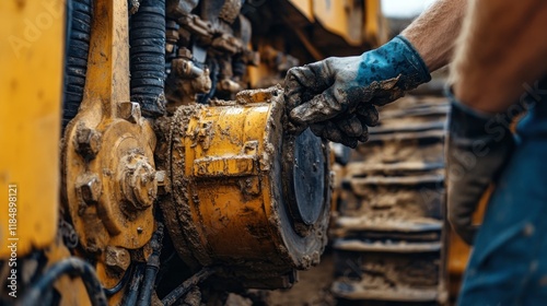 machinery, mechanic, repair, maintenance, engine, equipment, construction, industrial, men at work, hand, glove, dirty, mud, dirtied, yellow, metal, part, detail, component, track, vehicle, heavy, powerful, tough, hard-wearing, strong, engineering, technology, industry, job, occupation, service, professional, expertise, skill, life events, labor, grit, grime, closeup, sharpened, texture