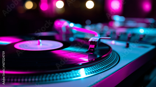 turntable, dj, vinyl, record, music, retro, club, party, sound, audio, disc, nightlife, neon, spin, track, mixer, equipment, vintage, technology, entertainment, stylus, lighting, playback, groove, scratch, performance, beat, purple, concert, electronic, phonograph, dance, night, event, classic, rotation, stage, stylised, nostalgia, bar, underground, deck, soundtrack, festival, flashy, glow, setup