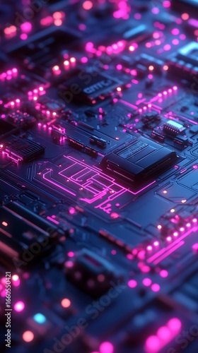 Close-up of a Futuristic Circuit Board with Pink and Blue Lights motherboard electronics photo