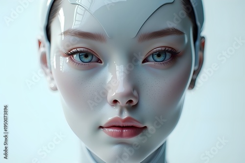 android, face, portrait, closeup, futuristic, synthetic, blue eye, headwear, smooth skin, freckle, detailed, beauty, technology, artificial intelligence, robotic, cyborg, digital artwork, illustration, modern, concept, design, person, individual, head, expression, complexion, light, youthful, unisex, neutral, abstract, creative, graphic