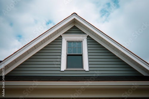 Close-up of a gable on a modern detached home featuring white fascia, rafters, soffit, ornamental white trim, and a rectangular double-hung attic window against a cloudy backdrop