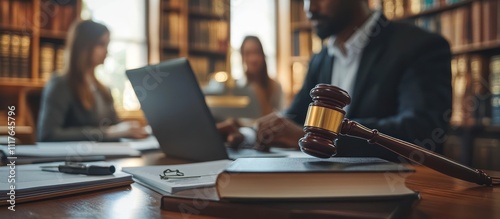 Close-up of a gavel lying on a book with a lawyer and client in the background.