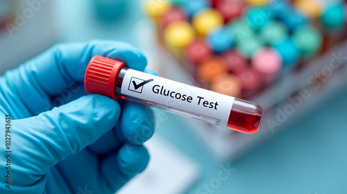 Close-up of a gloved hand holding a blood sample labeled Glucose Test in a laboratory setting. Glucose Test Sample Held by Gloved Hand in the Medical Laboratory Analysis