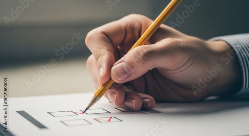 Closeup of a hand holding a pencil marking a checklist on a paper concept of assessment.