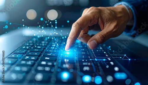 Close-up of a hand interacting with a glowing laptop keyboard, digital network connections visualized