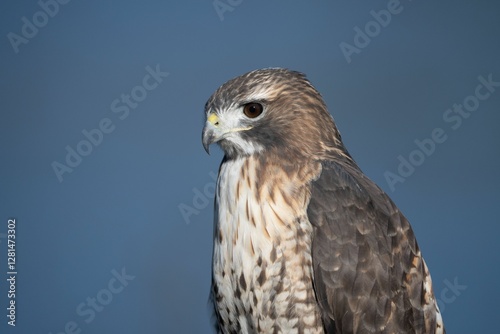 Close-up of a hawk against blue sky.