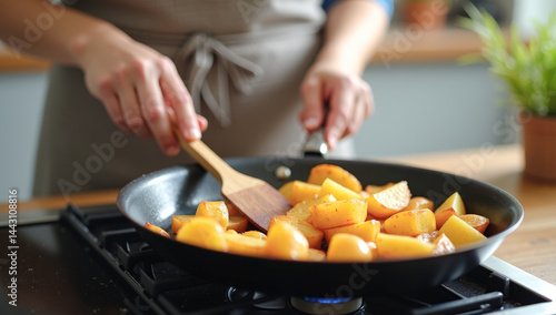 close-up of a housewife's hands stirring fried potatoes in a frying pan