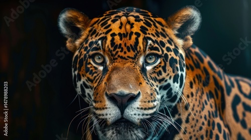 Close-up of a jaguar's face, showing its distinct spotted pattern, keen eyes, and powerful presence