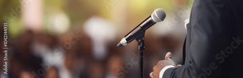 Close-up of a man in a suit standing next to a microphone with a blurred audience in the background. Public speaking or conference concept. Design for banner, presentation, poster.