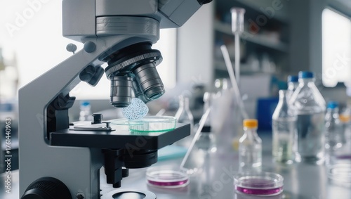 Close-up of a microscope, petri dishes, and lab equipment on a lab bench
