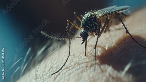 Close-Up of a Mosquito Feeding on Human Skin, Capturing Intricate Details of Insect Anatomy and the Process of Blood-Sucking, Highlighting Nature's Intriguing Interactions
