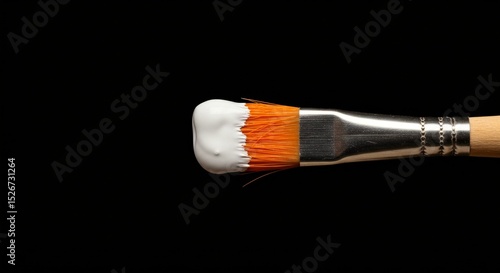 Close-up of a paint brush loaded with thick, white paint against a stark black background creating contrast.