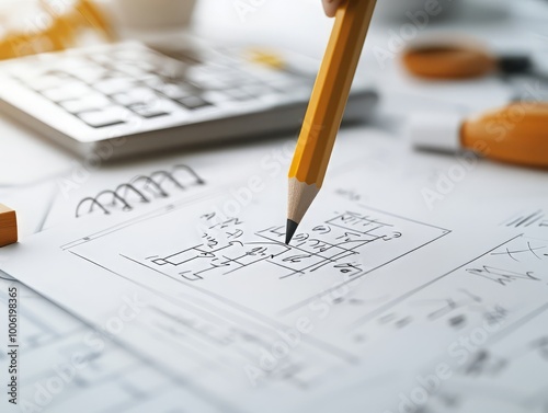 Close-up of a pencil drawing on a blue print with a calculator, emphasizing creativity and engineering design in an office setting.