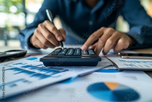 Close-up of a person's hand using a calculator while looking at financial reports.