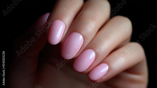person, hand, finger, apart, nail, painted, light, pink, polish, glossy, finish, tip, neatly, manicured, background, black, making, racked