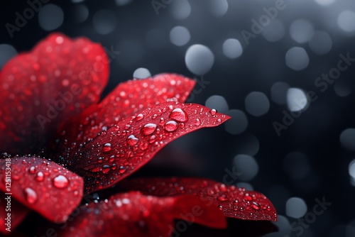 Close-up of a red flower petal adorned with raindrops against a blurred dark background