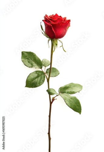 rose, red, flower, bloom, blossom, plant, floral, isolated, white, background, single, stem, leaf, green, nature, beauty, romantic, love, gift, valentine, elegant, fresh, bright, vibrant, delicate, closeup, botanical, flora, object, studio, nobody, season, spring, summer, romance, symbol, simple, design, decoration, natural, botany, flowering, birthday, anniversary, tenderness, pure, pristine, blank