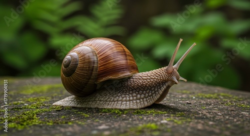 Close-up of a roman snail crawling on a stone with a green background enhancing nature's beauty