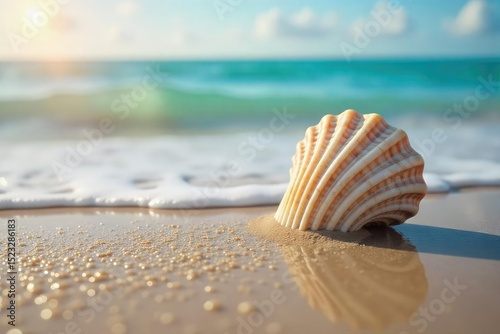 Close-up of a seashell, gentle waves lapping the shore, a tranquil beach scene evoking serenity and peaceful sounds of the ocean Perfect for relaxation and meditation themes , sea, vacation