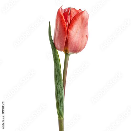 flower, tulip, coral, blossom, bloom, single, red, pink, vibrant, nature, spring, garden, isolated, macro, detail, botanical, floral, colours, beauty, elegant, organic, natural, fresh, pretty, close, up, stem, green, leaf, foliage, bud, vertical, studio, light, soft, photo, image, still, life