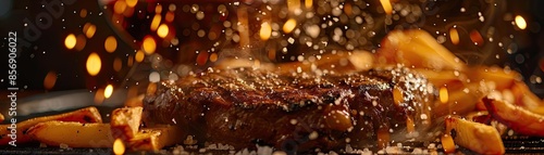 Close-up of a sizzling steak with golden fries on a dark wooden surface, garnished with herbs and seasoning, and flames in the background.